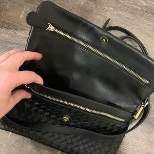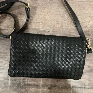 Elegant woven design. Sleek black finish. Adjustable strap. Perfect for any occasion. Comes with dust bag.