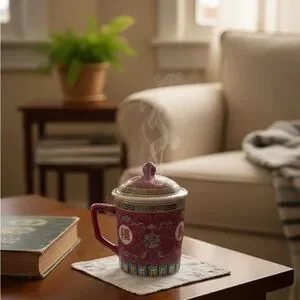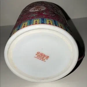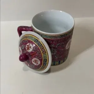 Add a touch of vibrant elegance to your collection with this beautiful Mun Shou Famille Rose porcelain tea mug. This classic Chinese lidded mug features a stunning deep pink (rose) ground, intricately decorated with traditional scrolling lotus vines and the four "Wan Shou Wu Jiang" characters, which translate to "Longevity Without Boundaries."