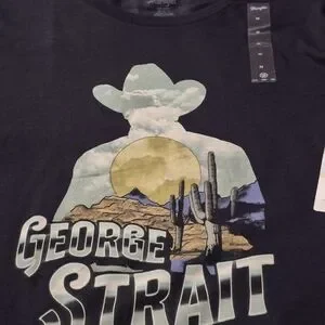 Stylish Medium George Strait Wrangler Western short sleeve tee with a desert scene. Features cacti and mountains. Ideal for casual wear.