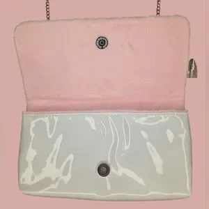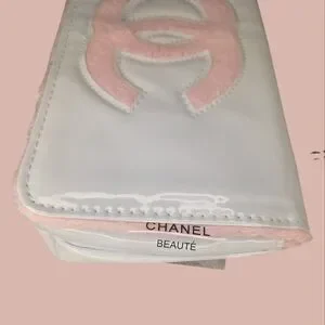 Chanel patent leather pouch, white and pink color with pink terry cloth fabric.