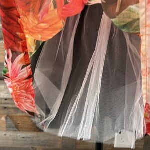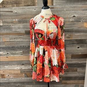 Vibrant floral mini dress. Features long sleeves and tie neckline. Perfect for a bold look.