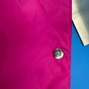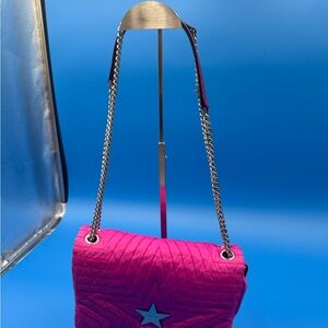 Fuchsia quilted nylon shoulder bag with silver chain strap. Features a star emblem detail, vegan leather trim, two way strap. All pockets are clean, magnetic clasp strong, zippers run smooth.