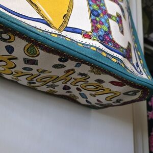 Brighton tote with bold LOVE design. Features vibrant colors and teal handles.