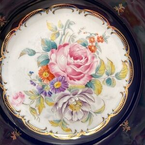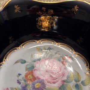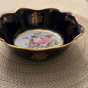 This exquisite vintage porcelain candy dish by Couleuvre features a stunning floral design with a rich cobalt blue background and elegant gold trim. Made in France, the bowl measures 6.25” in diameter and 2” in depth. A unique piece for candy or nuts.