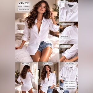 Elevate your wardrobe with this elegant Vince 100% cotton button-down shirt in size Medium. Crafted from soft, breathable cotton, this classic white blouse features beautiful ladder-style embroidered trim along the front placket and shoulders for a subtle designer touch.
