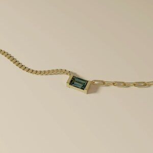 A 6x4mm London blue topaz glow as it is set suspended in a custom sterling silver vermeil channel set necklace. Floating between mismatched medium curb and medium paperclip chains at 4mm width and at an adjustable length of 16" or 18", this gem is a piece of wearable tranquility.