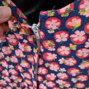 Cute dress, needs repair on hem going up the side. looks torn and frayed. This is a small. Not sure if its juniors or a womens small. Fabric is cotton. zipper works.