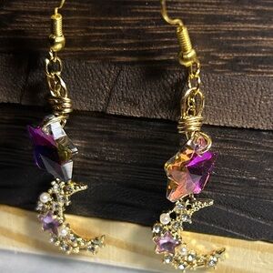 Elegant purple star and crescent moon earrings with gold accents. Perfect for adding a touch of celestial charm to any outfit.