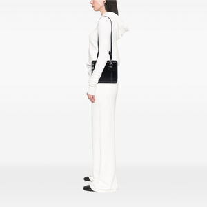 The Lady Dior features a lambskin leather body with crystal and stud embellishments, flat leather top handles, a detachable flat leather strap, a top zip closure, and an interior zip pocket. It carries an AB condition rating.