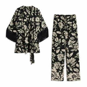 Beautiful NWT Eliane Rose two-piece floral set in black, cream, and green botanical print. Features a kimono-style top with dramatic fringe sleeves, a belted waist, and matching wide-leg trousers. A chic, vacation-ready statement set—perfect for special occasions, resort, brunch, or evening wear.