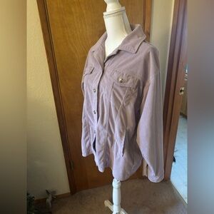 Stylish blush pink utility shirt jacket. Features button-up front and chest pockets. Ideal for casual wear. Perfect for layering as it gets colder.
