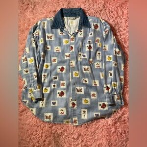 Vintage Quizz button-up shirt featuring a blue gingham base with patchwork-style fruit, butterfly, and floral prints and a contrasting denim collar. A true 90s cottagecore piece with a relaxed, easy fit.