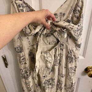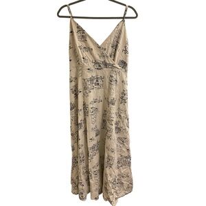 Step out in style with this elegant beige linen printed dress from Anthropologie, “by the River” brand with a delightful print of a French Parisian cafe. Perfect for any occasion, but it would be amazing on a trip to France! Or the Mediterranean or Europe. Size large, this dress offers a chic and comfortable fit. The intricate print adds a touch of sophistication to your wardrobe. Spaghetti straps with beautiful linen fabric and bow back with cut out. Like new!