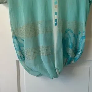 Aqua blue baby tee by early 2000s Calvin Klein Jeans. Features a blue and white patterned design. Has a sort of twisted hem at the bottom for an elegant touch. Soft and lightweight mesh. Can be fitted as a work blouse or causal layering. 100% nylon