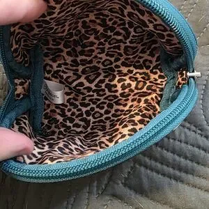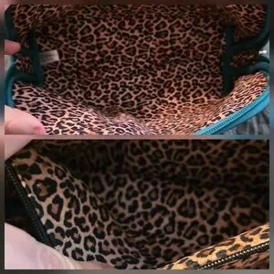 Zipper closures on both. Large cosmetic bag has 1 interior zip pocket. Both have leopard print lining.
