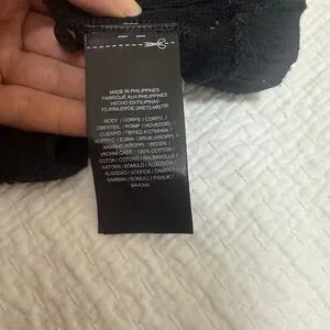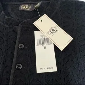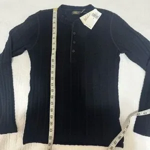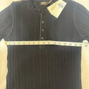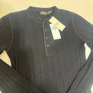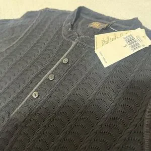 Elegant black Henley top with intricate texture. Features button closure. Sheer. Size 2, stretchy. Brand new with tags. 100% cotton