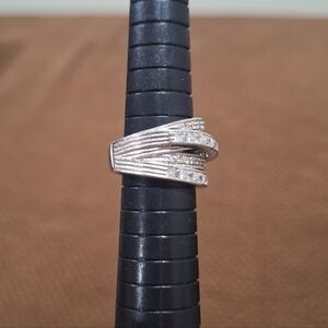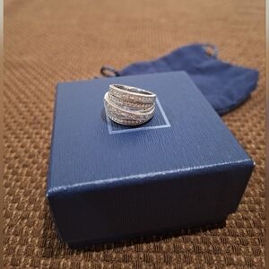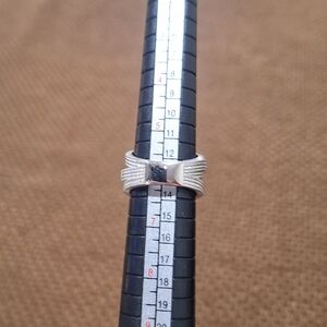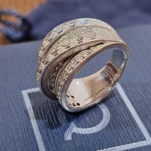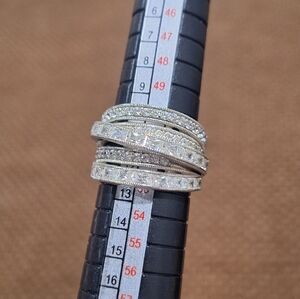 Beautiful authentic Judith Ripka sterling silver “5 Band Highway” style ring featuring layered crossover bands with sparkling pavé stones and signature milgrain detailing. This bold designer piece gives the look of stacked rings in one sculptural statement design — a classic Ripka aesthetic loved by collectors.