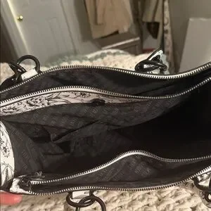 Elegant tote with black floral patterns on a white background. Features bold Steve Madden branding. Ideal for daily use.