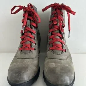 Stylish Sorel ankle boots with bold red laces. Durable gray exterior. Perfect for any occasion. These shoes are preowned and in great condition with light wear. Minimal staining, scuffing, and worn soles are considered normal. These are true vintage and preserved very well. Please inspect pictures to make sure they are up to your standards and reach out with any questions.