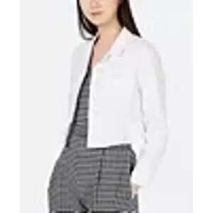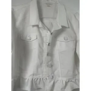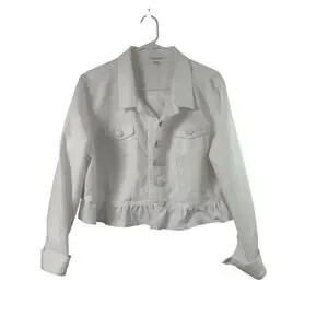 Polished with a feminine twist. Elevate your wardrobe with this Calvin Klein white ruffle-hem jacket in Size XL. Structured yet feminine, this piece blends classic tailoring with a soft peplum-style ruffle for a flattering silhouette. Perfect for spring layering, workwear, or chic weekend styling.