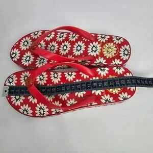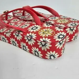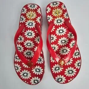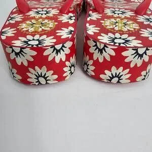 Tory Burch Red Flower Print Wedge Heel Flip Flop Sandals Women's Size Unmarked