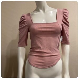 Cool meets pretty on this ribbed top cut from fitted jersey, and styled with puff shoulders, square necklines and a curved hem.