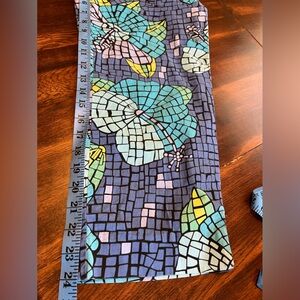 Floral stained glass effect print with yellow, blue, pink and green on darker blue background. Bi-stretch fabric of 97% cotton and 3% spandex. Button and zipper closure, one small front pocket by waistband. Split hems at ankles. 24” inseam. Very good preowned condition, no flaws noted. O2