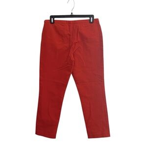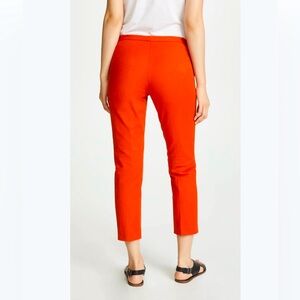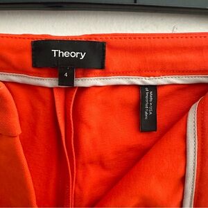 These vibrant red skinny pants from Theory feature a cropped ankle-length design and a slight texture that suggests a comfortable cotton blend material. The fit is tailored with a straight or slightly tapered leg, making them a stylish choice for any occasion.