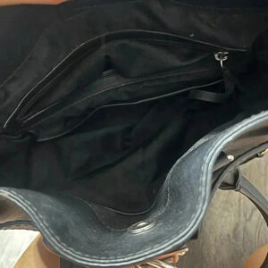 Two 18 in handles; 30 in shoulder leather strap with chainlink detail