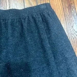 St. John Collection by Marie Gray knit skirt in a sophisticated black/dark gray with subtle metallic silver sparkles throughout. This elegant piece features a comfortable elasticized waistband with gentle gathering that creates a flattering drape. The signature Santana knit texture provides a structured yet flexible fit, making it a versatile staple for professional or evening wear.