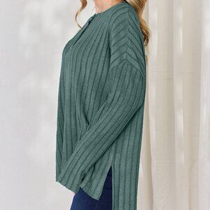 NWT Basic Bae Full Size Ribbed Half Button Long Sleeve High-Low T-Shirt