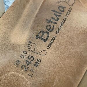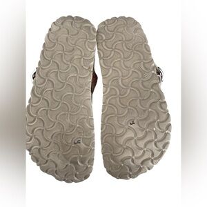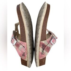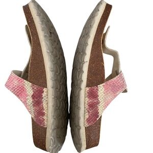 Stylish Birkenstock sandals with pink and cream pattern. Comfortable footbed. Perfect for casual wear.