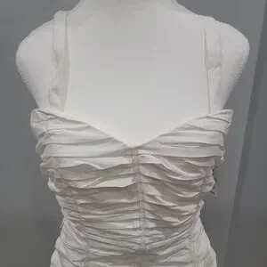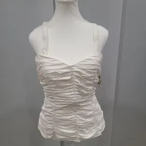 Chic white camisole with ruched design. Perfect for layering or wearing alone. Adds elegance to any outfit.