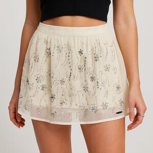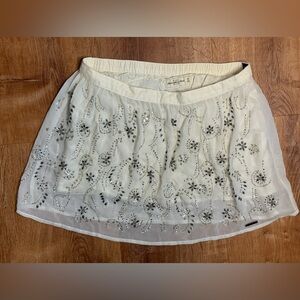 New with tags Y2K Abercrombie & Fitch mini skirt in a soft cream/ivory shade with intricate rhinestone and beaded floral embellishments throughout. Features a flattering mini length with a lightweight sheer overlay and smooth waistband. In women’s size XS.
