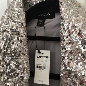 Shine bright with this stunning silver sequin jacket. Perfect for adding a touch of glamour to any outfit.