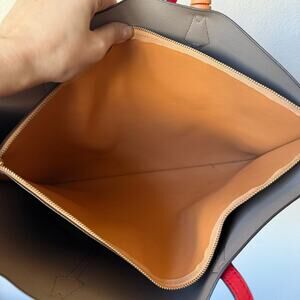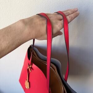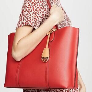tags: tory burch perry tote, red leather tote bag, triple compartment tote, work tote women, structured leather handbag, large designer tote, everyday luxury bag, laptop tote, statement red handbag