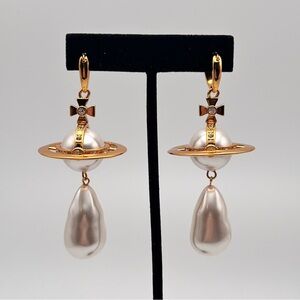 Stunning statement Vivienne Westwood drop earrings featuring the signature Orb silhouette with crystal accents, glossy faux pearl planet detail, and large baroque-style pearl drops.