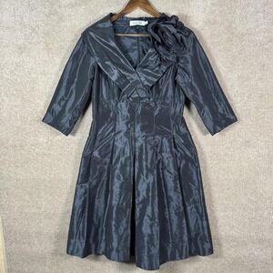 Pre-owned dress with light general wear and wrinkling from normal use and storage. Fabric, seams, lining, and floral shoulder appliqué are clean and intact without stains, holes, or snags. Back zipper functions properly, and interior brand and care labels are present and legible.