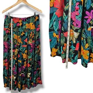 Vintage tiered maxi skirt in a vibrant tropical floral print features a breezy 100% rayon fabric with a comfortable elastic waistband. The colorful botanical pattern includes hibiscus and palm fronds in shades of red, orange, purple, and green against a black background. Crafted in the USA from German fabric, this bohemian-inspired piece offers a flowing silhouette perfect for vacation or summer styling. Very good pre-owned condition with no noted flaws.