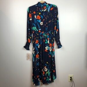 New with tags! This beautiful dress has a smocked high neck, waist and cuffs. It’s a high low style, a keyhole on the back, 3 buttons on the neck, a beautiful flower print and long sleeves. One of the buttons loops is loose. Comes from a smoke free home. It has an extra button.