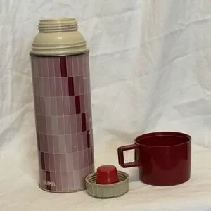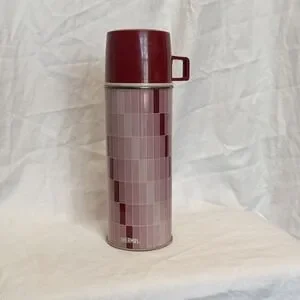 Vintage Metal 1970's Thermos Pink Metal glass w Cup Stopper 722 check plaid