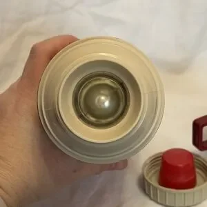 The product is a vintage Thermos lunchbox from the 1970s, featuring a classic pink metal design with a glass stopper. It also includes a matching plastic cup. Made in the United States, this collectible item is a nostalgic piece of retro memorabilia that would be a unique addition to any collection of vintage lunchboxes or Thermoses. The Thermos brand is well-known for its durable and reliable food storage products, making this piece both functional and stylish for use or display.