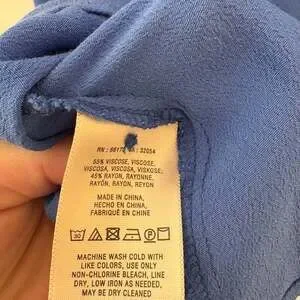 Maeve Lene Faux Wrap Dress, Periwinkle Blue — Medium Petite. This stylish dress features a flattering faux wrap silhouette, a V-neckline, long sleeves that can be rolled up and secured with button tabs, and an elasticated waist for a comfortable fit. The crepe-like fabric drapes beautifully, making it suitable for both casual and more dressed-up occasions. Perfect for spring and summer wear. In excellent pre-owned condition with no visible flaws.