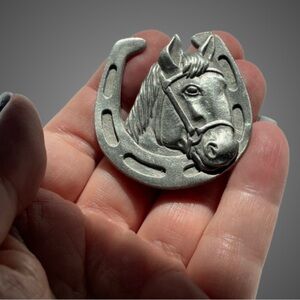 Vtg Spoontiques Pin Art pewter metal horse head & horseshoe brooch equestrian. Great for Triple Crown season. Brooch marked on the back. Comes with original backing card.