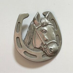 Vtg Spoontiques Pin Art pewter metal horse head & horseshoe brooch equestrian