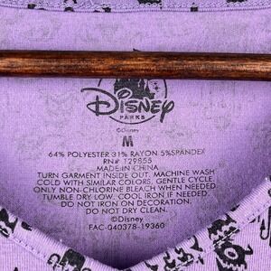 Materials and fabrication: Lightweight, stretchy jersey fabric composed of 64% polyester, 31% rayon, and 5% spandex for comfort and ease of movement. Interior printed neck label reads Disney Parks with size L, RN# 129855, Made in China, and care instructions including machine wash cold, gentle cycle, tumble dry low, and cool iron if needed. Additional identifier on the label reads FAC-040378-19360.