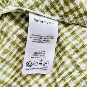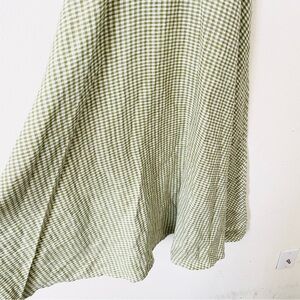 Reformation Monette 100% flax linen sleeveless Aline midi dress in Avocado green white check gingham print. Adjustable straps, back zip closure