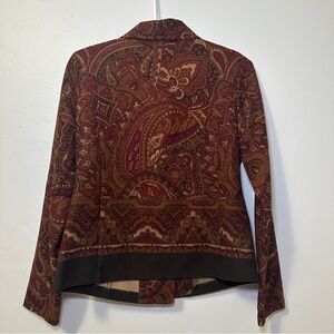 Statement blazer featuring a rich paisley print in deep burgundy, brown, and warm earth tones. Designed with structured shoulder pads that create a sharp, flattering silhouette and a polished, vintage-inspired look. Button-front closure with a classic collar and long sleeves. Fully lined for comfort, with a contrasting solid trim at the hem for a tailored finish. Perfect for elevating denim, trousers, or styled as a standout layering piece.
