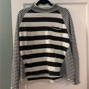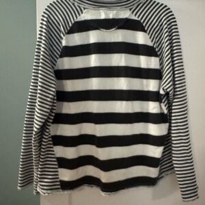 Upgrade your wardrobe with this stylish black and white striped long sleeve tee. Perfect for any casual occasion, it combines comfort with a chic look. Light wash wear.