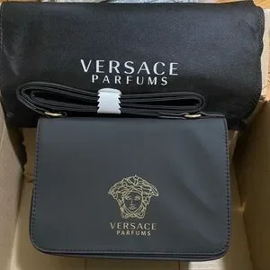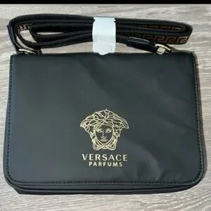 New Versace Parfums La Medusa black crossbody bag featuring gold-toned Medusa hardware and a Greca motif strap. Material: Body 100% PU, lining 100% polyester. Measurements: H 5.5” x W 9” x D 3” ( depth expanded to 4”). Condition: New